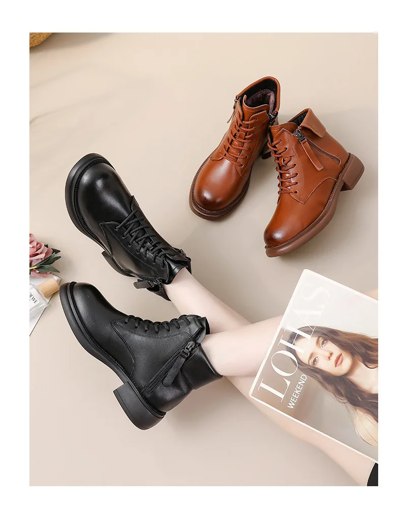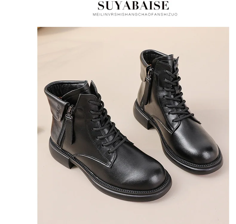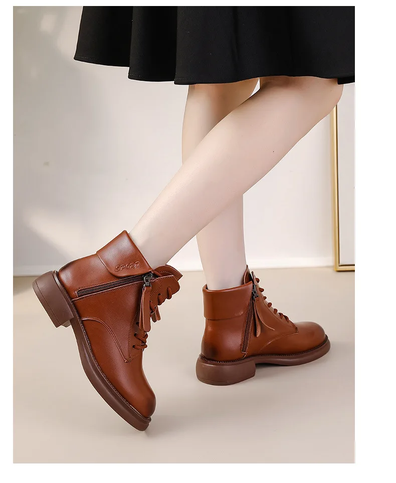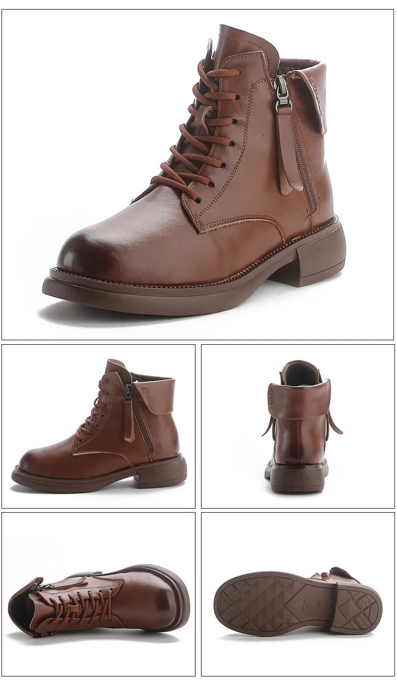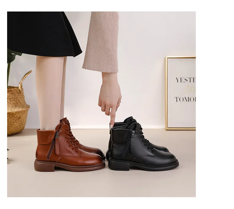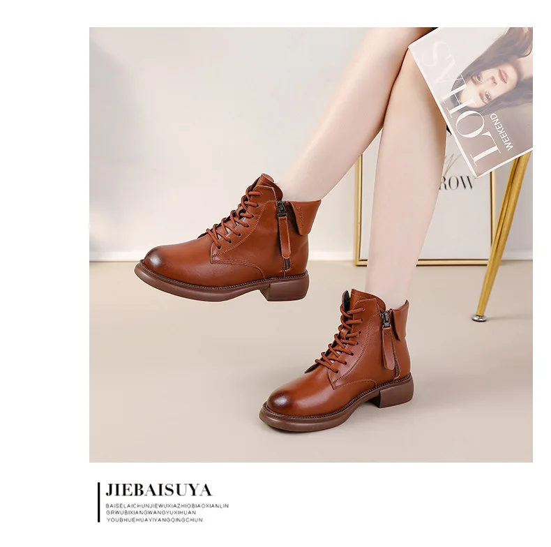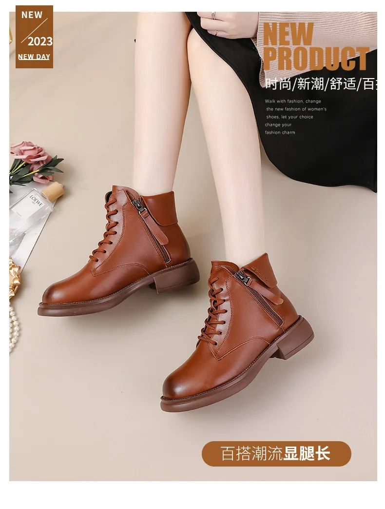 2024 Autumn New Low Heel Bull Muscle Sole Ankle Boots Korean Edition Casual Genuine Leather Women's Boots Warm and Comfortable