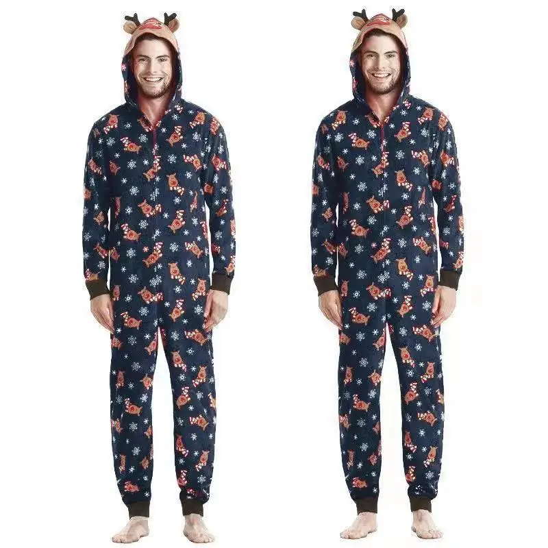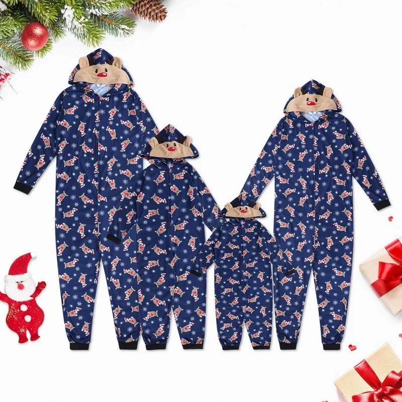 2025 Christmas Cartoon Deer Cute Family Matching Outfit Adults Kids Zipper Jumpsuit Elk Ear Hooded Romper Xmas Look Wear Pijamas