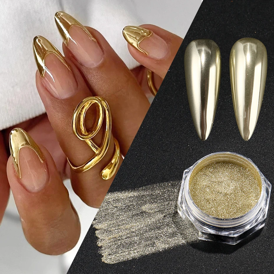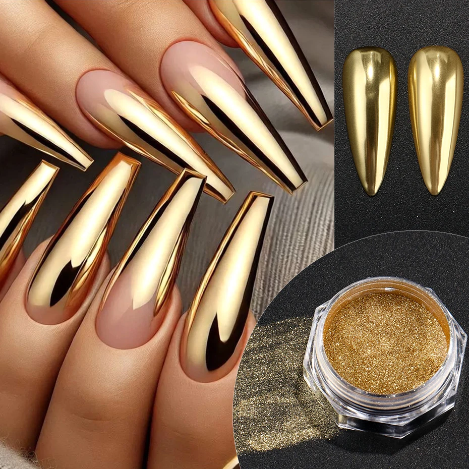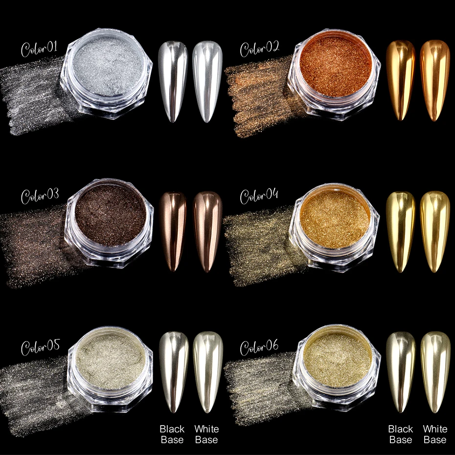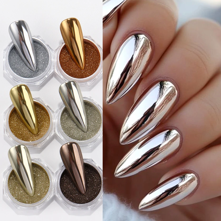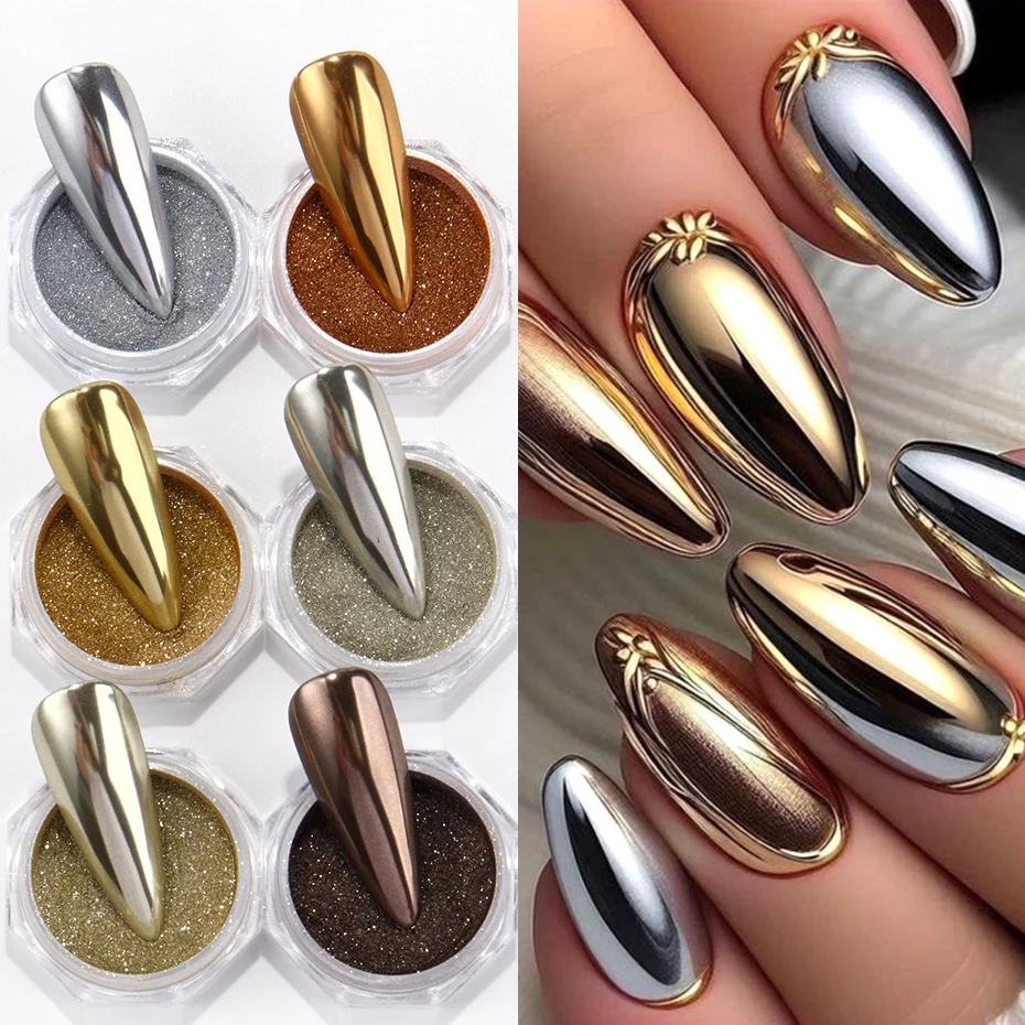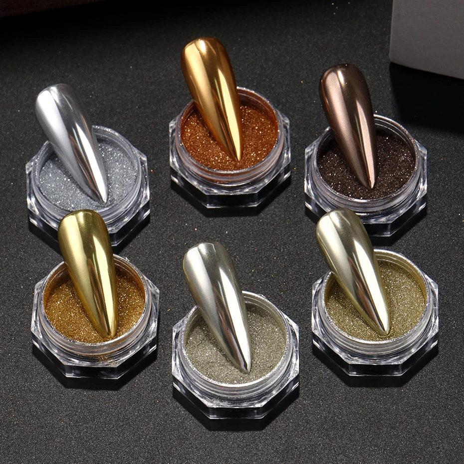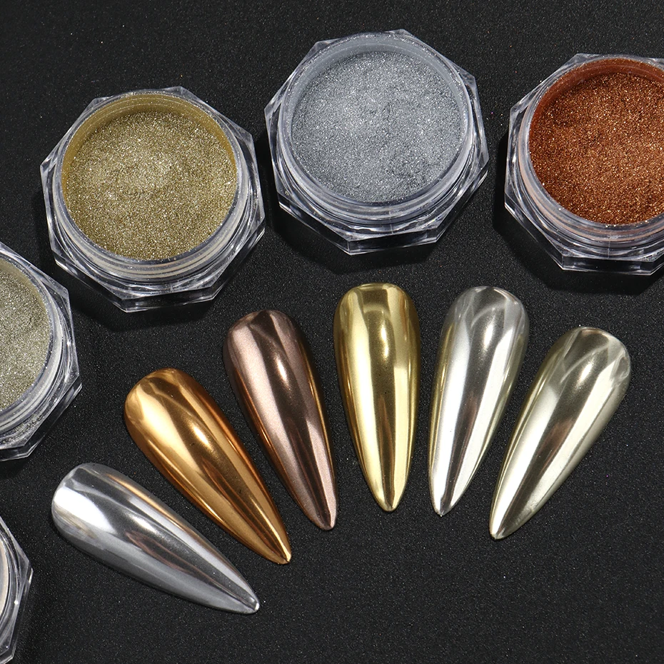 6 Box Gold Silver Metallic Mirror Glitter Nail Art Dust Champagne Gold Chrome Powder Rubbing Pigment Flake Dust Decorations