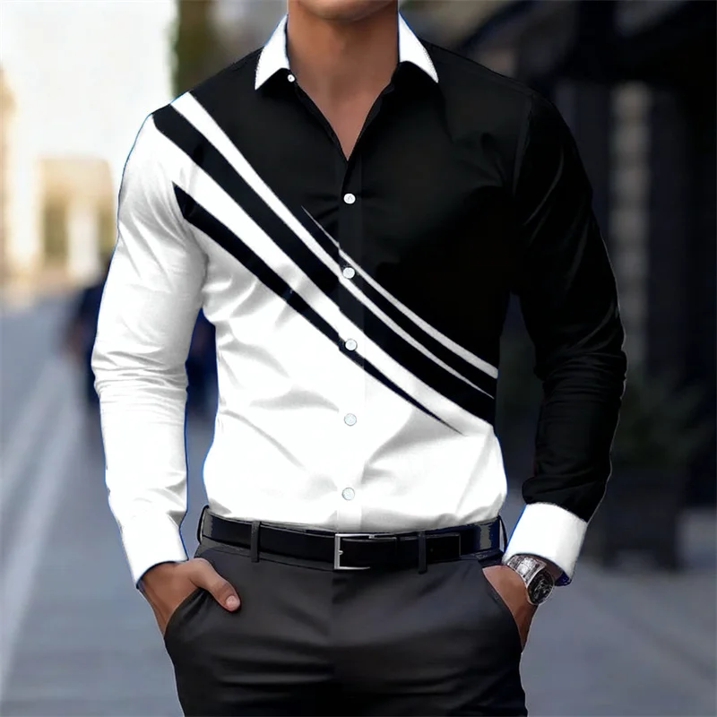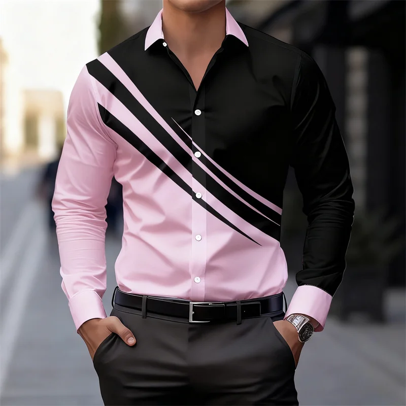 Men's color-blocked striped long-sleeved shirt, slim fit, stylish and unique business casual shirt, trendy new men's top, XS-6XL