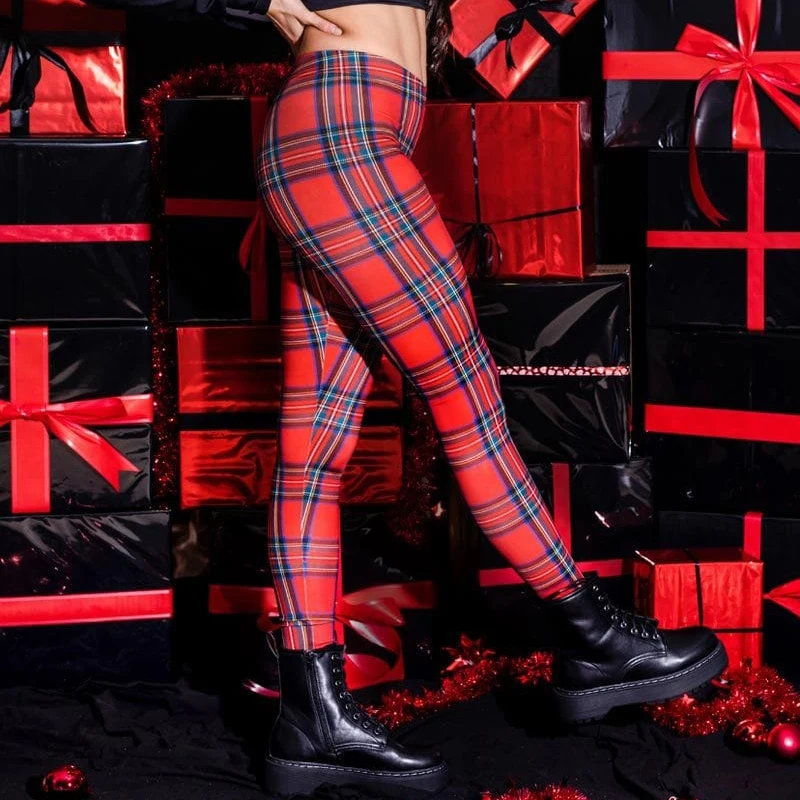 [You're My Secret] 12% Spandex New Year Party Red Tartan 3D Digital Printed Workout Leggings for Women Stretch Pants Trousers